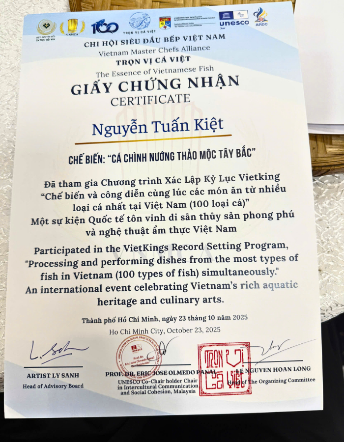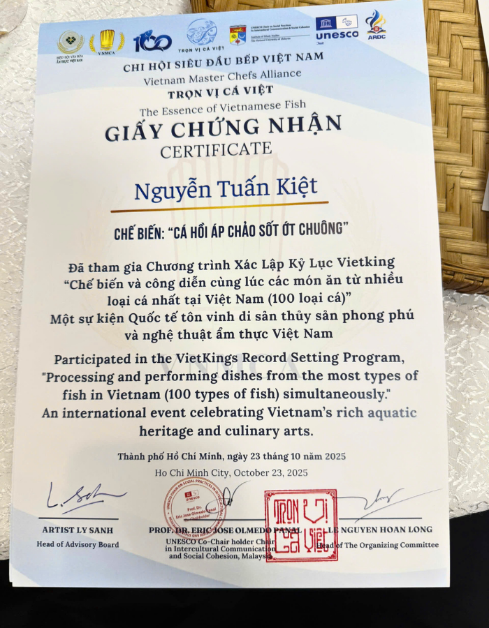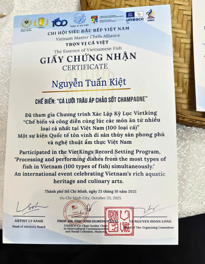 Ngày 23/10/2025, tại sự kiện ẩm thực do Chi hội Siêu đầu bếp Việt Nam tổ chức, Bếp trưởng Nguyễn Tuấn Kiệt – đại diện Hoàng Yến – đã xác lập Kỷ lục Việt Nam cho “Sự kiện chế biến và công diễn cùng lúc các món ăn từ nhiều loại cá nhất”. Thành tích ấn tượng này không chỉ tôn vinh tài năng của Chef Kiệt, mà còn là minh chứng cho chuyên môn sâu sắc và niềm đam mê bất tận của Hoàng Yến với nguyên liệu “tủ” – CÁ.